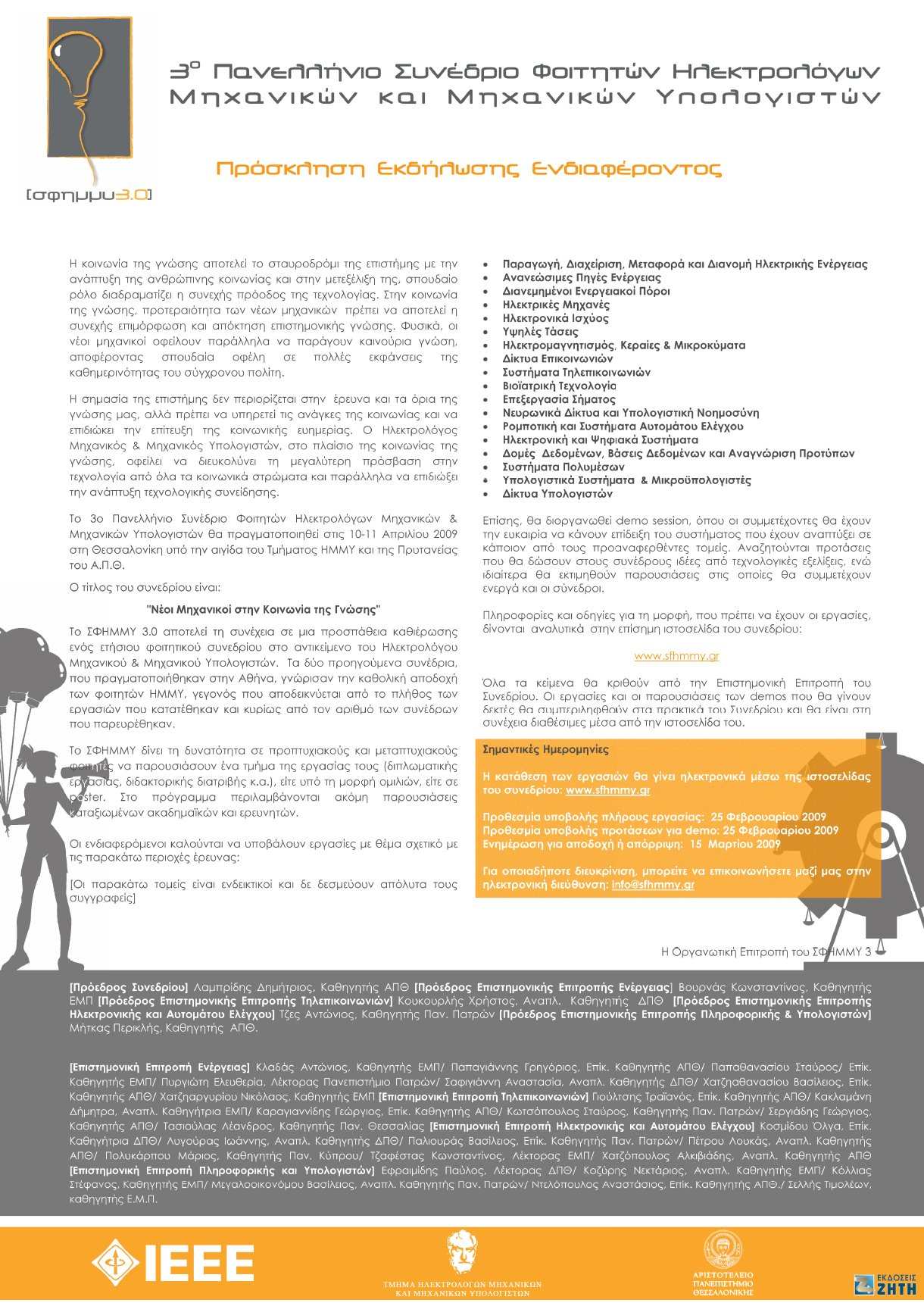 To 3o Πανελλήνιο Συνέδριο Φοιτητών Ηλεκτρολόγων Μηχανικών & Μηχανικών Υπολογιστών θα πραγματοποιηθεί στις 10-11 Απριλίου 2009 στη Θεσσαλονίκη υπό την αιγίδα του Τμήματος Ηλεκτρολόγων Μηχανικών & Μηχανικών Υπολογιστών και της Πρυτανείας του Α.Π.Θ.