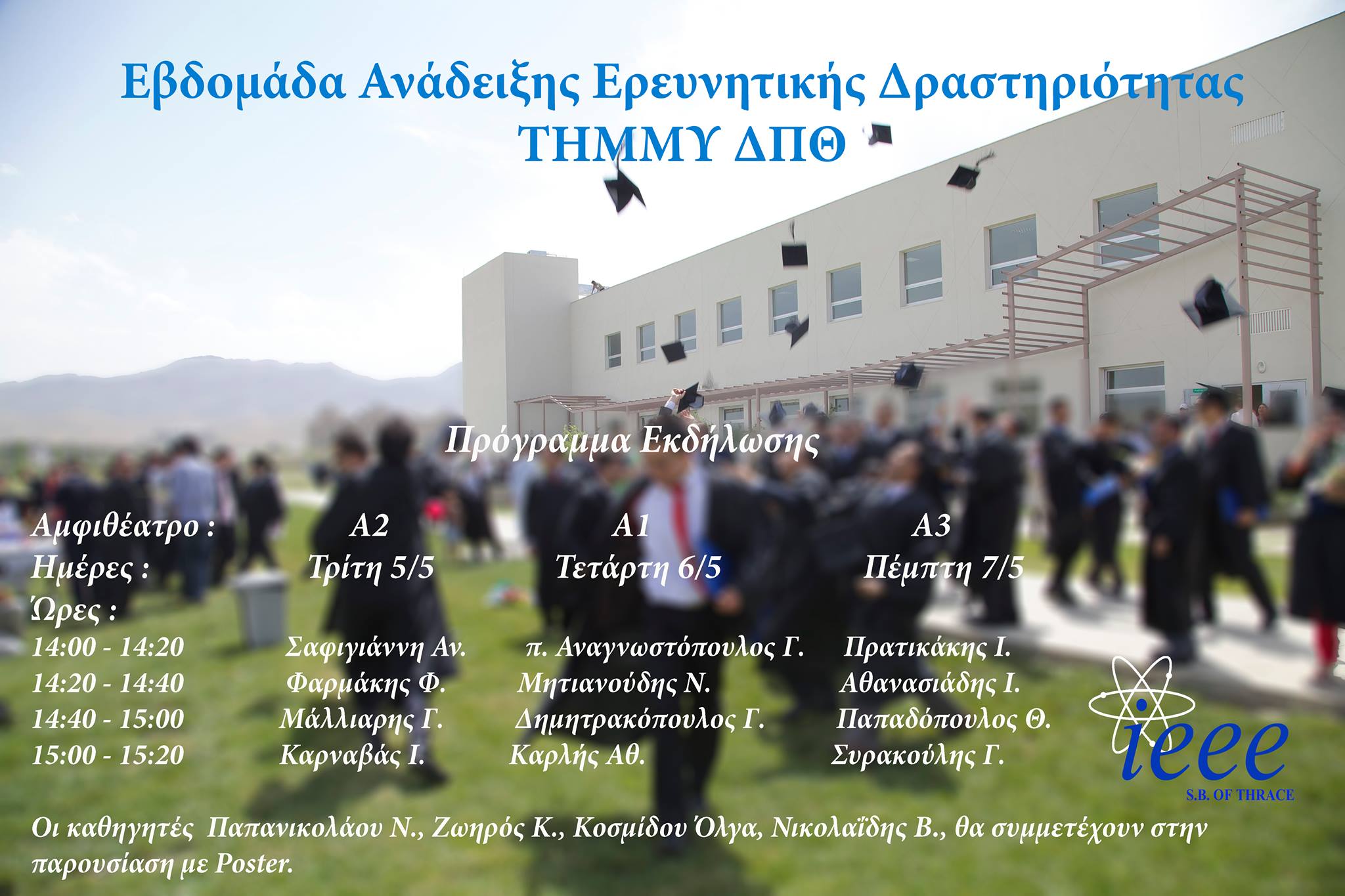 Το IEEE Student Branch of Thrace σε συνεργασία με το ΤΗΜΜΥ διοργανώνει σειρά παρουσιάσεων για την ανάδειξη των ερευνητικών προγραμμάτων που διεξάγονται στο τμήμα μας. Οι καθηγητές του τμήματός μας θα παρουσιάσουν το έργο και το αντικείμενό τους.