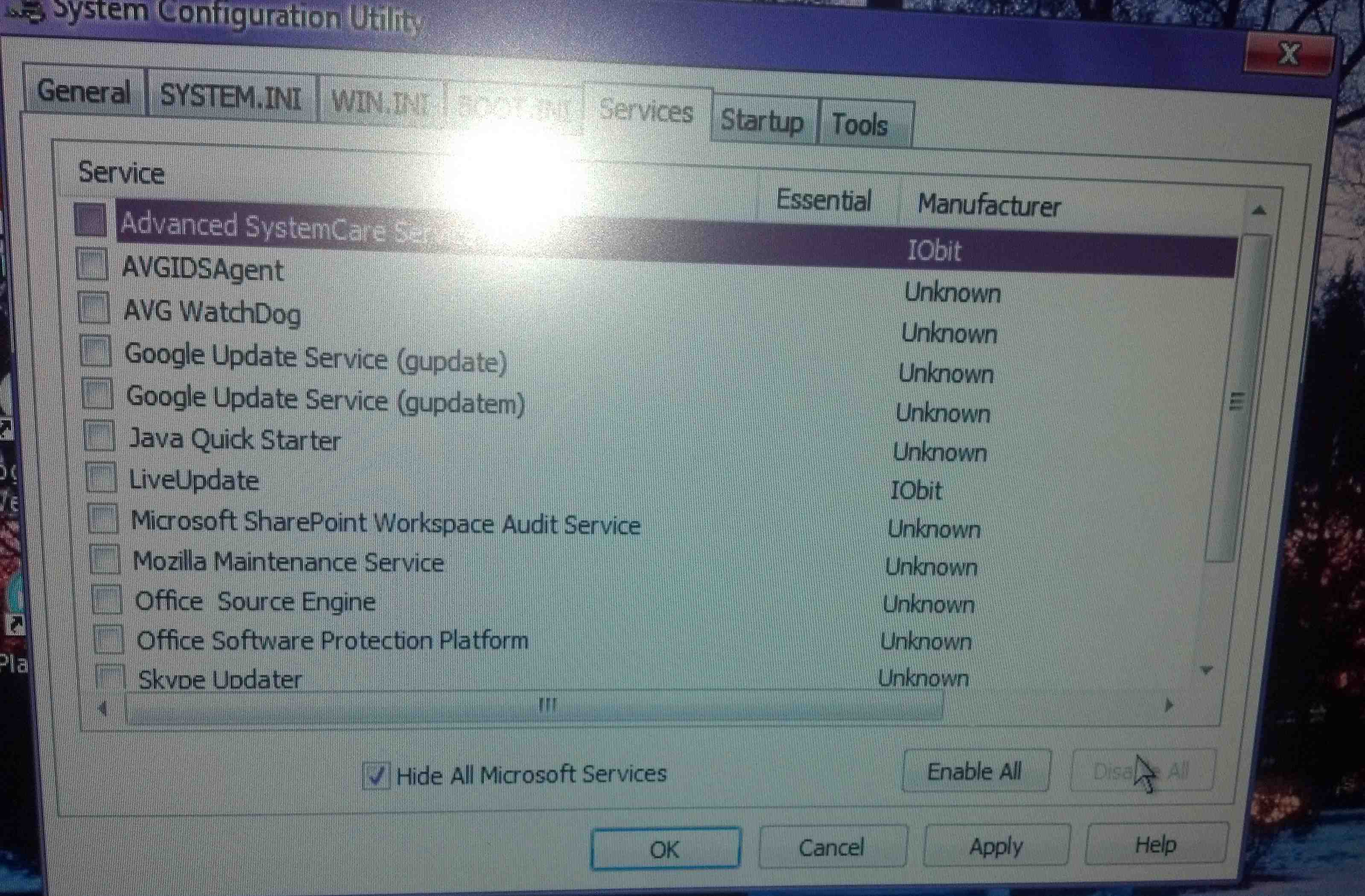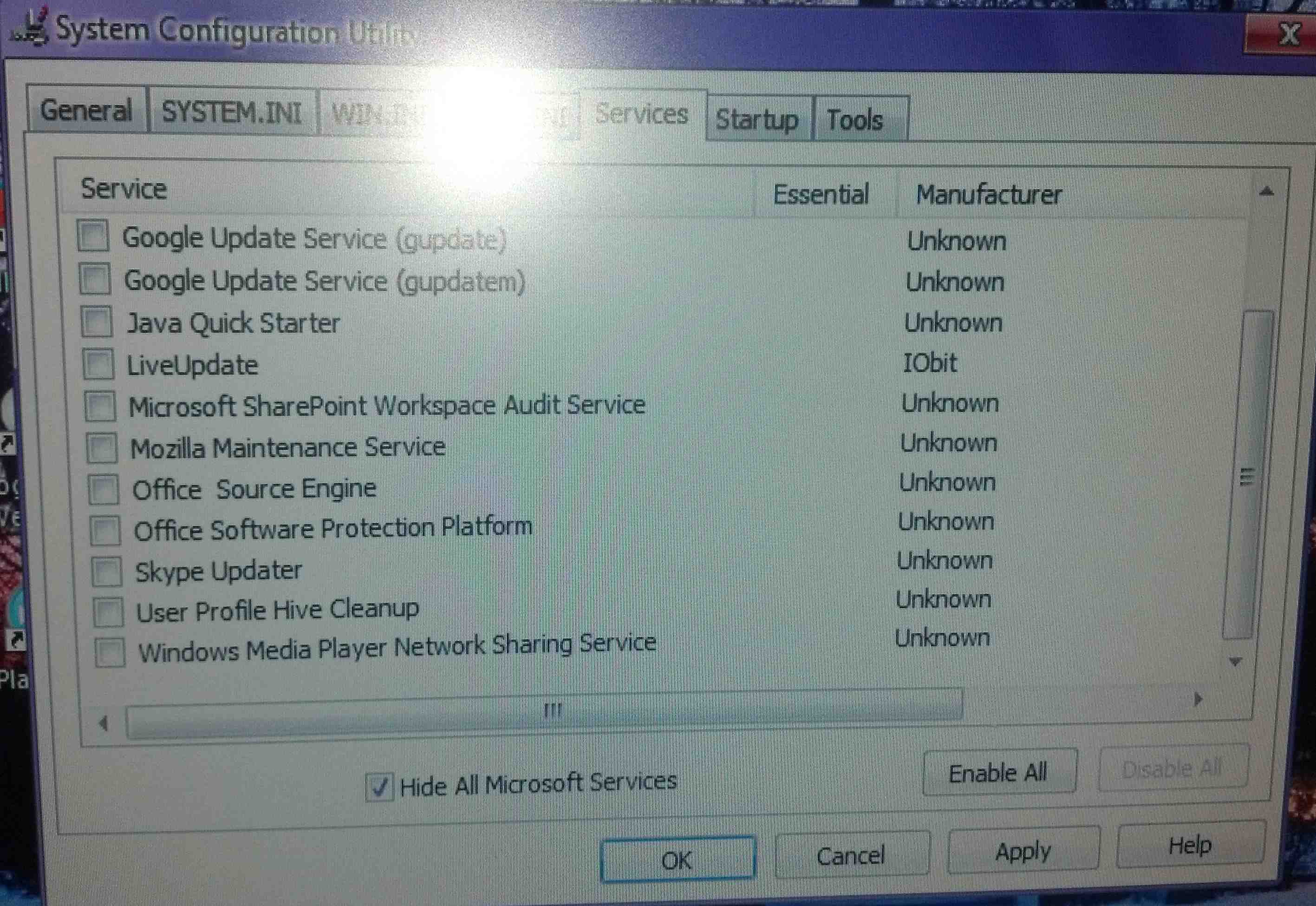 Στις υπηρεσίες τσέκαρε το κουτί που λέει να μην εμφανίζονται οι υπηρεσίες της Microsoft και μετά αφαίρεσε τες όλες και δοκίμασε να μπεις πάλι.