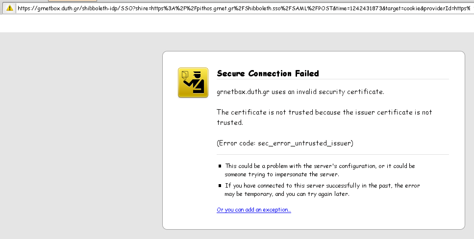 Εδώ και λίγες μέρες η υπηρεσία Shibboleth την οποία χρησιμοποιεί για πιστοποίηση το pithos.grnet.gr και άλλες υπηρεσίες τρίτων, δεν είναι πια σε πιλοτική φάση στο ΔΠΘ, και τo login γίνεται πλέον στο https://login.duth.gr/ και υπάρχει signed certificate.