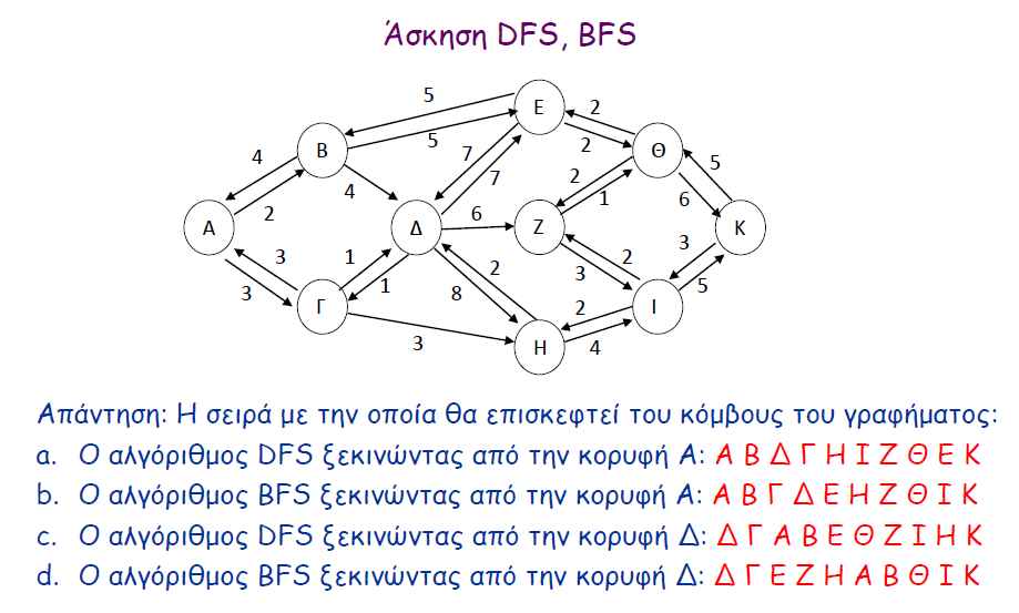 Ακόμη και όταν έχουν βάρη οι ακμές (διαφάνεια 51/64 του αρχείου "DSAlg03 graphs.pdf" στο ερώτημα d), τα BFS και DFS χρησιμοποιούν το γράμμα του κόμβου για να τους κατατάξουν; Δεν χρησιμοποιούμε τα βάρη;