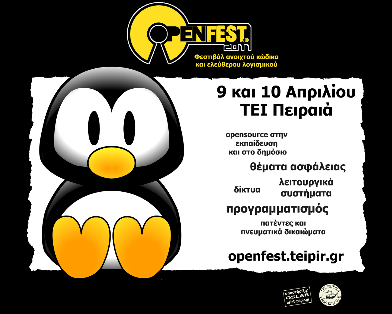 Οι σπουδαστές των Ηλεκτρονικών Υπολογιστικών Συστημάτων του ΤΕΙ Πειραιά σας προσκαλούν για δεύτερη συνεχή χρονιά στο φεστιβάλ ανοικτού κώδικα και ελεύθερου λογισμικού που θα γίνει στο ΤΕΙ Πειραιά στις 9-10 Απριλίου του 2011. Οι ομιλίες και τα workshops θα κινηθούν γύρω από τις εξής θεματικές ενότητες: