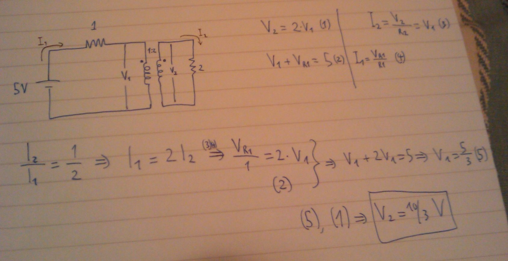 το θέμα είναι ότι αν είναι 10V η τάση στα άκρα του δεξιού μέρους του μετασχηματιστή τότε στο αριστερό μέρος θα είναι 5V άρα η τάση της αντίστασης θα είναι 0 ...