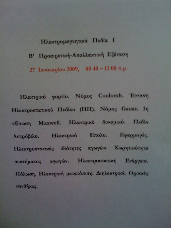 ' rows='20' cols='60'>Mετά από έντονη προσπάθεια και ενστάσεις για την καθυστέρηση παραλαβής του βιβλίου "ΗΛΕΚΤΡΟΔΥΝΑΜΙΚΗ Ι", πριν από δέκα μέρες περίπου λάβαμε την απάντηση από τους υπευθύνους ότι αυτό θα ήταν διαθέσιμο στο Βιβλιοπωλείο "Παπασωτηρίου" Δευτέρα με Τρίτη 19 - 20 / 1. Λόγω της συνεχιζόμενης καθυστέρησης επικοινωνίσαμε πάλι με τους υπευθύνους την Πέμπτη 22/1 και μας διαβεβαίωσαν ότι τα βιβλία έχουν σταλεί, και ότι η τελική καθυστέρηση οφείλεται στην διακοπή των συγκοινωνιών λόγω της διαμαρτυρίας των αγροτών.