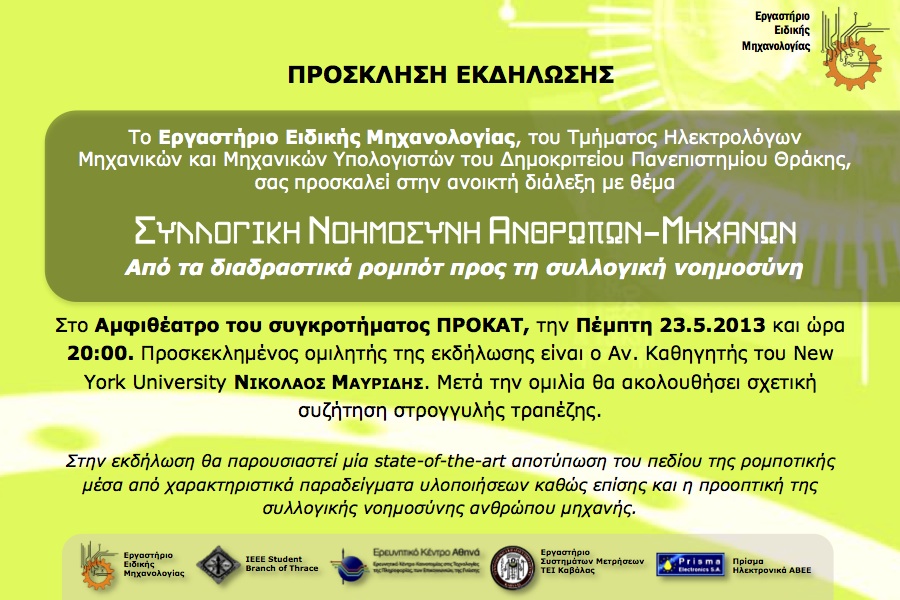Ο καθ. Νικόλαος Μαυρίδης, προσκεκλημένος ομιλητής του Εργαστηρίου Ειδικής Μηχανολογίας του Τμήματος ΗΜ&ΜΥ, θα μιλήσει την Πέμπτη 23 Μαΐου 2013 και ώρα 20:00 στο Αμφιθέατρο Συγκροτήματος ΠΡΟΚΑΤ της Πολυτεχνικής Σχολής Ξάνθης για τη μετάβαση από τα διαδραστικά ρομπότ στη συλλογική νοημοσύνη ανθρώπου-μηχανής.